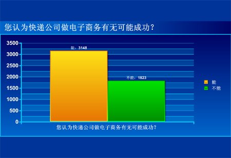 本次調(diào)查截止11月15日上午10時(shí),共有4971位騰訊網(wǎng)友參與,數(shù)據(jù)顯示,有3148位網(wǎng)友認(rèn)為快遞公司做電子商務(wù)有可能成功,占網(wǎng)友總數(shù)的63.33%;有1823名網(wǎng)友認(rèn)為快遞公司做電子商務(wù)部可能成功,占網(wǎng)友總數(shù)36.67%。