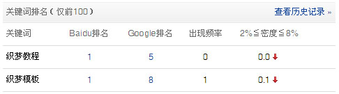 從上圖大家可以看出,那兩個(gè)關(guān)鍵詞的密度最高的那個(gè)也才是0.1%,只出現(xiàn)了一次,但排名依然比關(guān)鍵詞密度高的或者一些老站還要靠前,外鏈方面是占了少許優(yōu)勢,單向鏈接和全站鏈接不少,還有一方面是做好頁面關(guān)鍵詞布局和關(guān)鍵詞分詞。從網(wǎng)站首頁的title可以看出,網(wǎng)站并不是針對(duì)個(gè)別關(guān)鍵詞進(jìn)行優(yōu)化的,比如“織夢模板”或者“dedecms模板”等,而是我想網(wǎng)友在搜索引擎上搜索包含“織夢”或者“DedeCms”的關(guān)鍵詞的時(shí)候,我網(wǎng)站的頁面都能獲得良好的排名,所以才寫了這個(gè)首頁標(biāo)題,“織夢”和“dedecms”各重復(fù)了兩遍,沒有“模板”、“插件”和“教程”等關(guān)鍵詞了,這些關(guān)鍵詞我都寫在了首頁的description里面。title里面寫不了那么多文字,但可以在description里面寫清楚,告訴訪客你的網(wǎng)站是做什么的。這是首頁title方面的寫法,還有一點(diǎn)就是,網(wǎng)站內(nèi)容方面的建設(shè),來調(diào)整關(guān)鍵詞布局,發(fā)布新文章的時(shí)候我都會(huì)包含“織夢dedecms”在里面,這樣一來左邊文章列表頁h2標(biāo)簽基本都包含該關(guān)鍵詞,左右兩邊的關(guān)鍵詞都盡可能的分布均勻,所以很多包含“織夢”和“dedecms”的長尾關(guān)鍵詞都能獲得較好的排名。