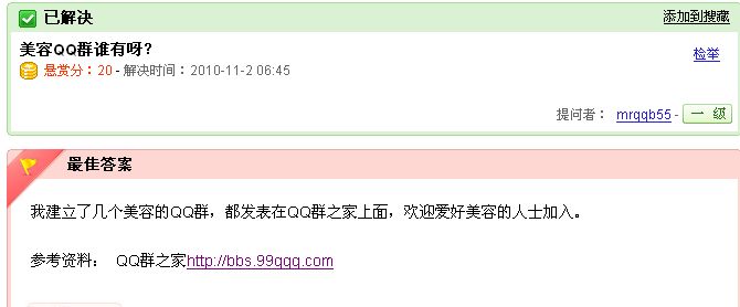 我把團員分為兩種,一種是百度知道賬號四級以下的團員,這些人可以提問,但是回答的時后添加鏈接有一定的限制,這種類別的團員我都安排他們去提問題,而且都是提各種和我網(wǎng)站有關的長尾關鍵詞問答,比如I做了一個QQ群之家的網(wǎng)站,我就安排他們提和各種QQ群有關的問題,如:美容的QQ群誰有呀?誰有商業(yè)QQ群呀?建筑QQ群誰有呀?等等,一種是百度知道賬號等級四級以上的團員,這種賬號可以可以在百度知道答案后面添加鏈接,于是我就安排他們專門來回答問題,并在答案的參考資料后面添加上我網(wǎng)站的鏈接。(如圖)
