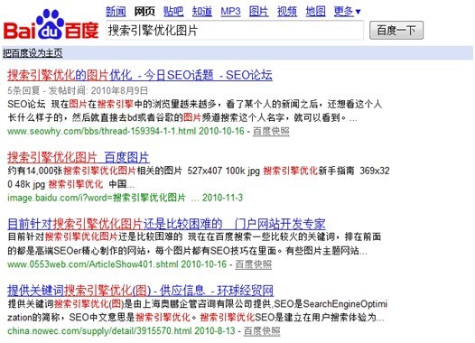 在輸入了含有雙引號的關(guān)鍵詞后,返回的結(jié)果是完全匹配了關(guān)鍵詞“搜索引擎優(yōu)化圖片”文字的結(jié)果,而下面的圖片則是包含關(guān)鍵詞“搜索引擎優(yōu)化圖片”且可能是分詞或組合詞的結(jié)果