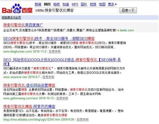 上圖為未增加intitle指令的搜索引擎結(jié)果,大家很容易發(fā)現(xiàn)只要在description或keyword或者正文有此關(guān)鍵詞都有可能被返回搜索結(jié)果,而運(yùn)用了intitle之后如下圖,很容易看到搜索結(jié)果必須是在網(wǎng)站的title中包含關(guān)鍵詞才被返回。這條命令的最大價值在于對某個關(guān)鍵詞更加深入的了解競爭對手(大家都說title很重要嘛)。