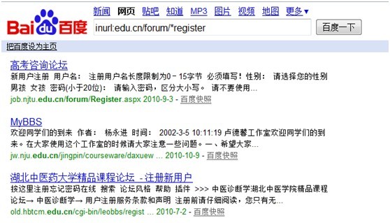 此條指令可能很多人不明白是什么意思,“inurl”——網(wǎng)址中包含edu.cn的網(wǎng)站同時含有forunm和register這2個單詞,*為通用符。因?yàn)榇蠹页S胒orunm和register表示注冊頁面。最終表達(dá)的意思所有教育類網(wǎng)站的注冊頁面,這樣很容易找到高價值的論壇來供大家發(fā)布外部鏈接