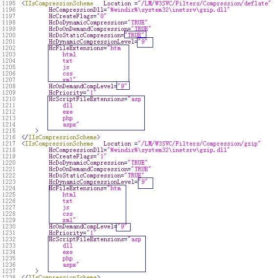 可以用記事本打開,找到 IIsCompressionScheme,有三個相同名字的段,分別是deflate,gzip,Parameters,第三段不用管它,前兩段有基本 相同的參數(shù)
