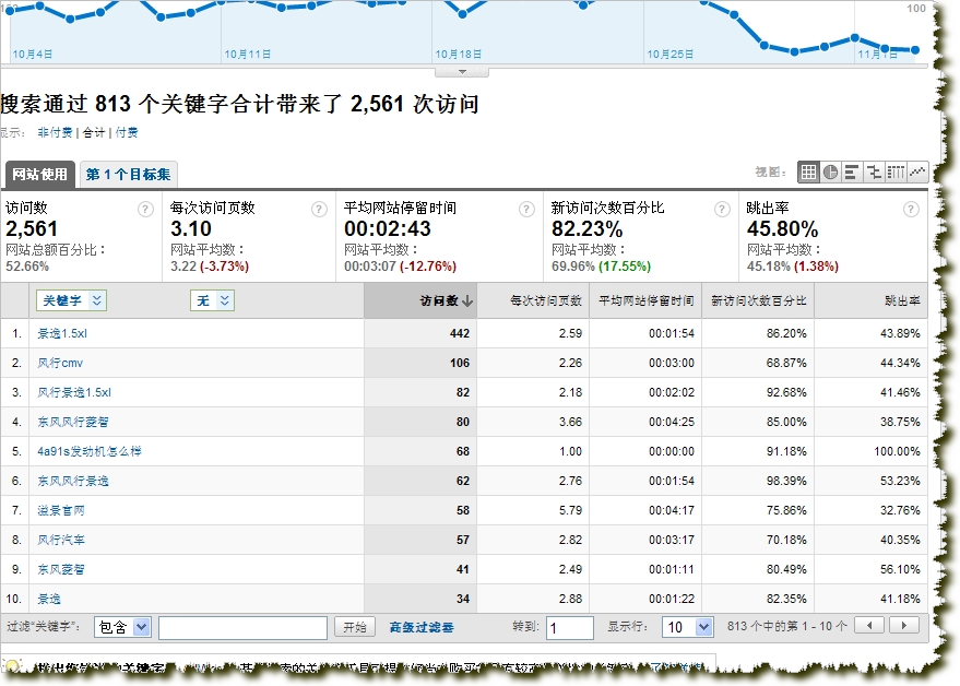 這里可以看到具體關(guān)鍵詞的訪問,跳出率=目標(biāo)轉(zhuǎn)換率,當(dāng)然你也可以做交叉分析,看看關(guān)鍵詞是哪個(gè)搜索引擎過來的,屬于什么訪問類型,用的瀏覽器,屏幕分辨率,地區(qū);總之很perfect!