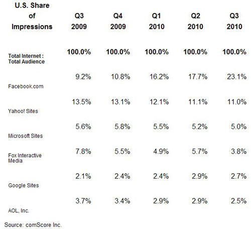 第三季度Facebook的美國顯示廣告印象為2970億次,市場份額為23%,雅虎顯示廣告印象為1410億次,市場份額為11%,其次是微軟(5%)、??怂够?3.8%)、Google(2.7%)、AOL(2.5%)。