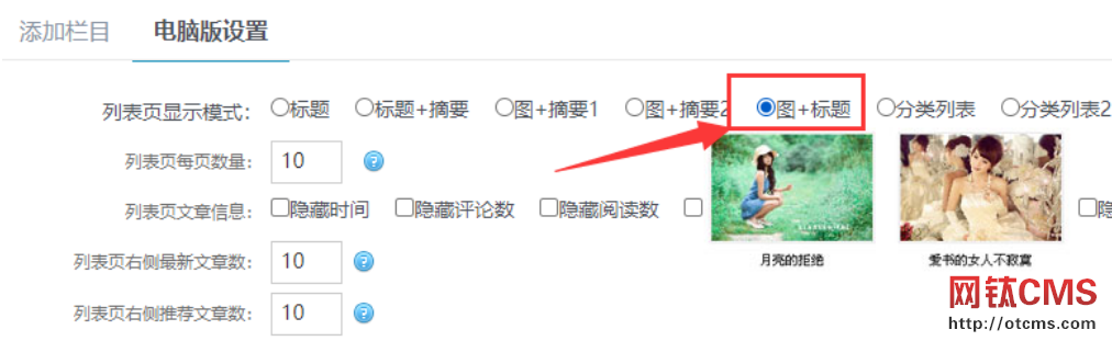 1、文章欄目:在新建欄目中,列表模式選擇 圖+標(biāo)題 模式。