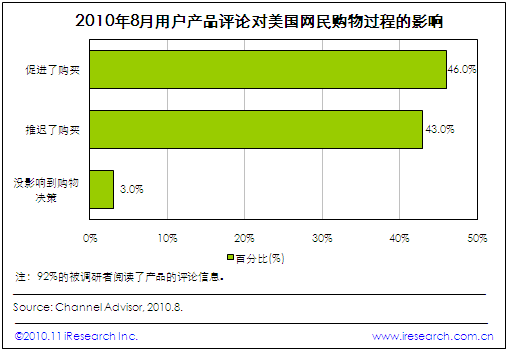 艾瑞咨詢iResearch整理2010年8月Channel Advisor的調(diào)研數(shù)據(jù)發(fā)現(xiàn),網(wǎng)上用戶產(chǎn)品評(píng)論,促進(jìn)了46%的美國網(wǎng)民進(jìn)行購物。數(shù)據(jù)顯示,被調(diào)查的美國網(wǎng)購用戶中,92%的用戶閱讀了產(chǎn)品的評(píng)論。其中,46%的表示產(chǎn)品評(píng)論信息促進(jìn)了其購買行為;而43%的則表示因?yàn)楫a(chǎn)品評(píng)論菹ⅲ推出了商品購買;另有3%的表示用戶的產(chǎn)品評(píng)論信息并未影響其購物決策。